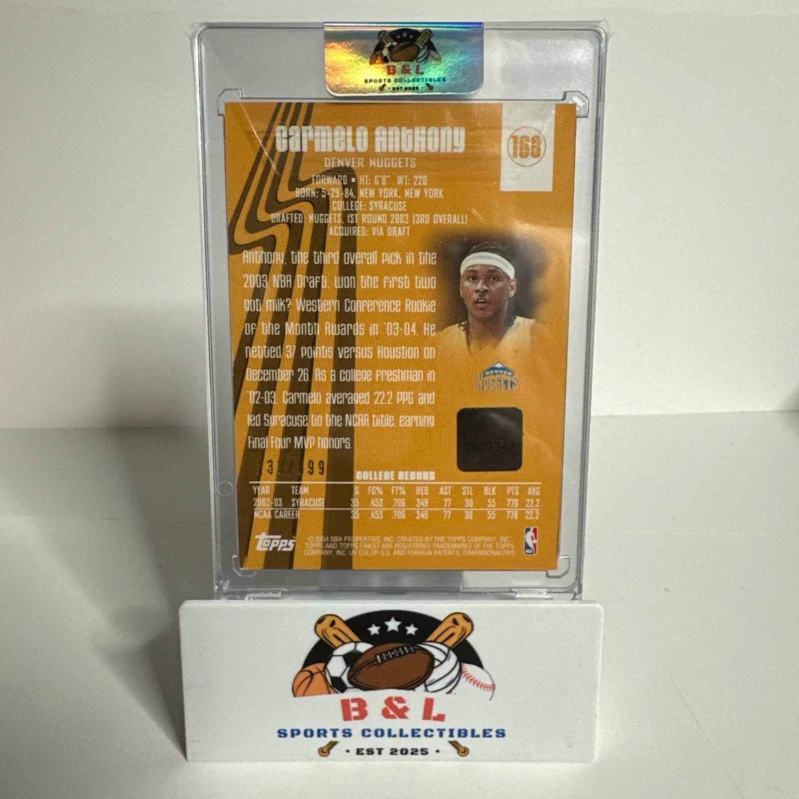 The product is a 2003-04 Topps Finest Carmelo Anthony autographed rookie card numbered 233/999. Signed by Carmelo Anthony himself, this single basketball trading card features the Denver Nuggets player in his early career. The card is from the original set, with a label or sticker autograph format, making it a valuable collectible for fans of both the NBA and Carmelo Anthony. With its serial number, base set, and rookie designation, this autographed card is a sought-after piece for collectors seeking memorabilia from one of the sport's most iconic players