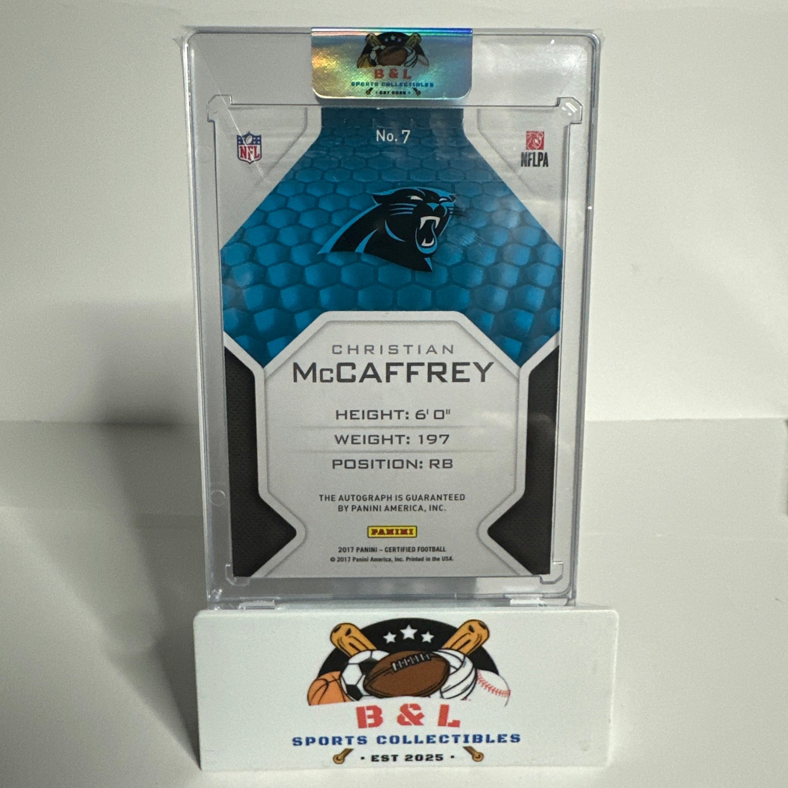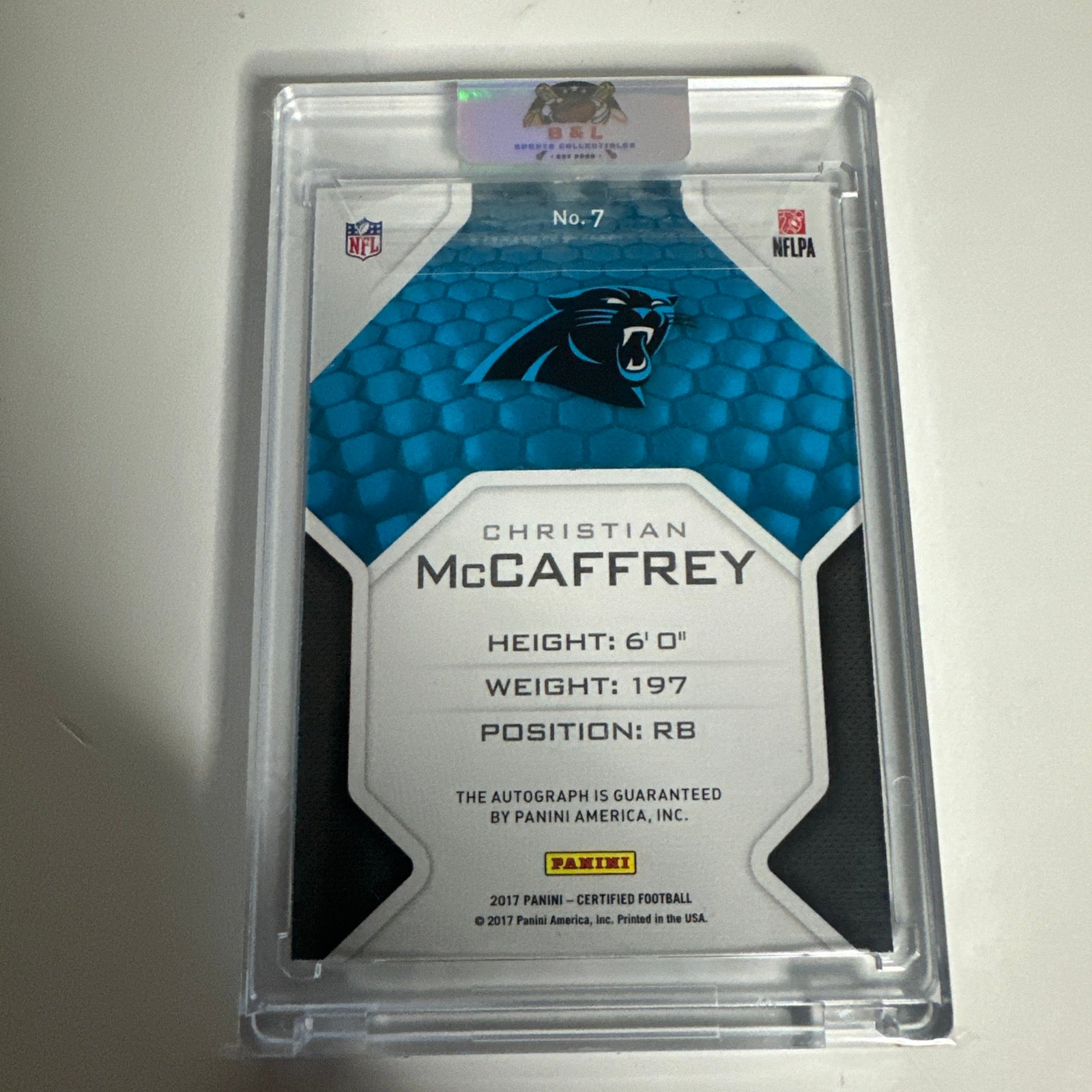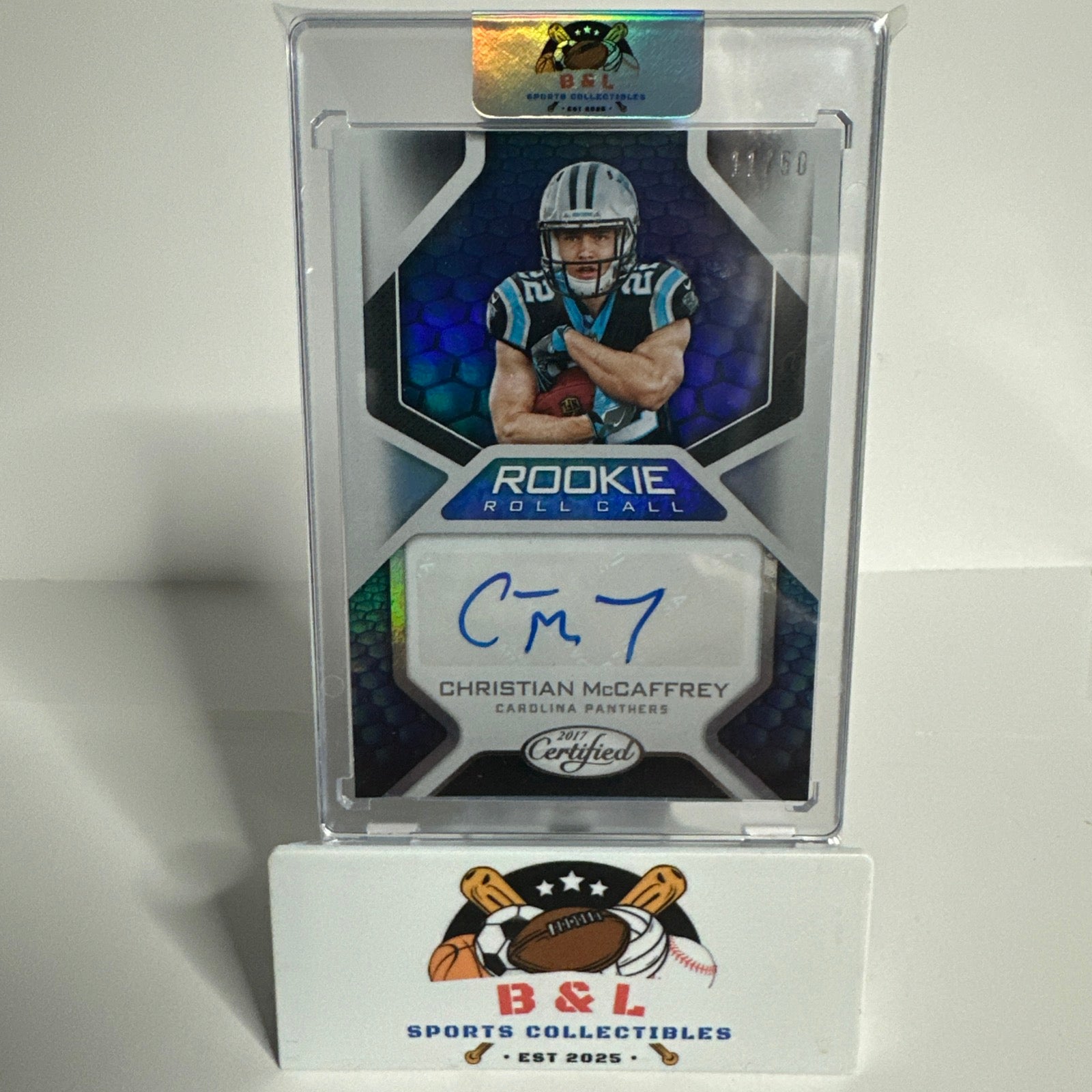 | The product is a 2017 Panini Certified Christian McCaffrey Rookie Roll Call autographed trading card, signed by the player himself. This limited edition card has a print run of only 50 copies, with the specific card being numbered 11/50. The card features Christian McCaffrey, who is a standout player in the National Football League for the Carolina Panthers. It is a valuable addition for collectors and fans of football memorabilia, especially for those interested in rookie cards. |