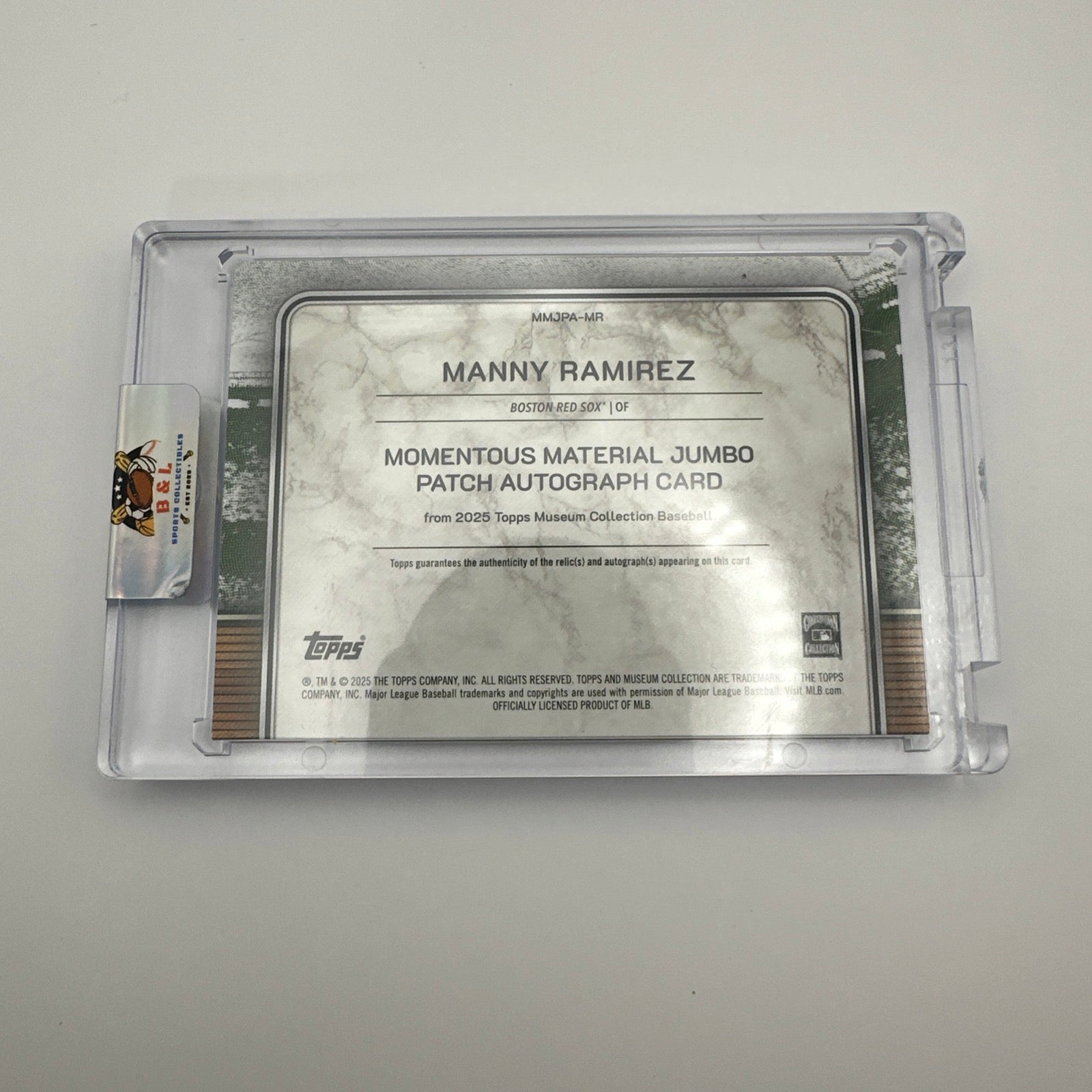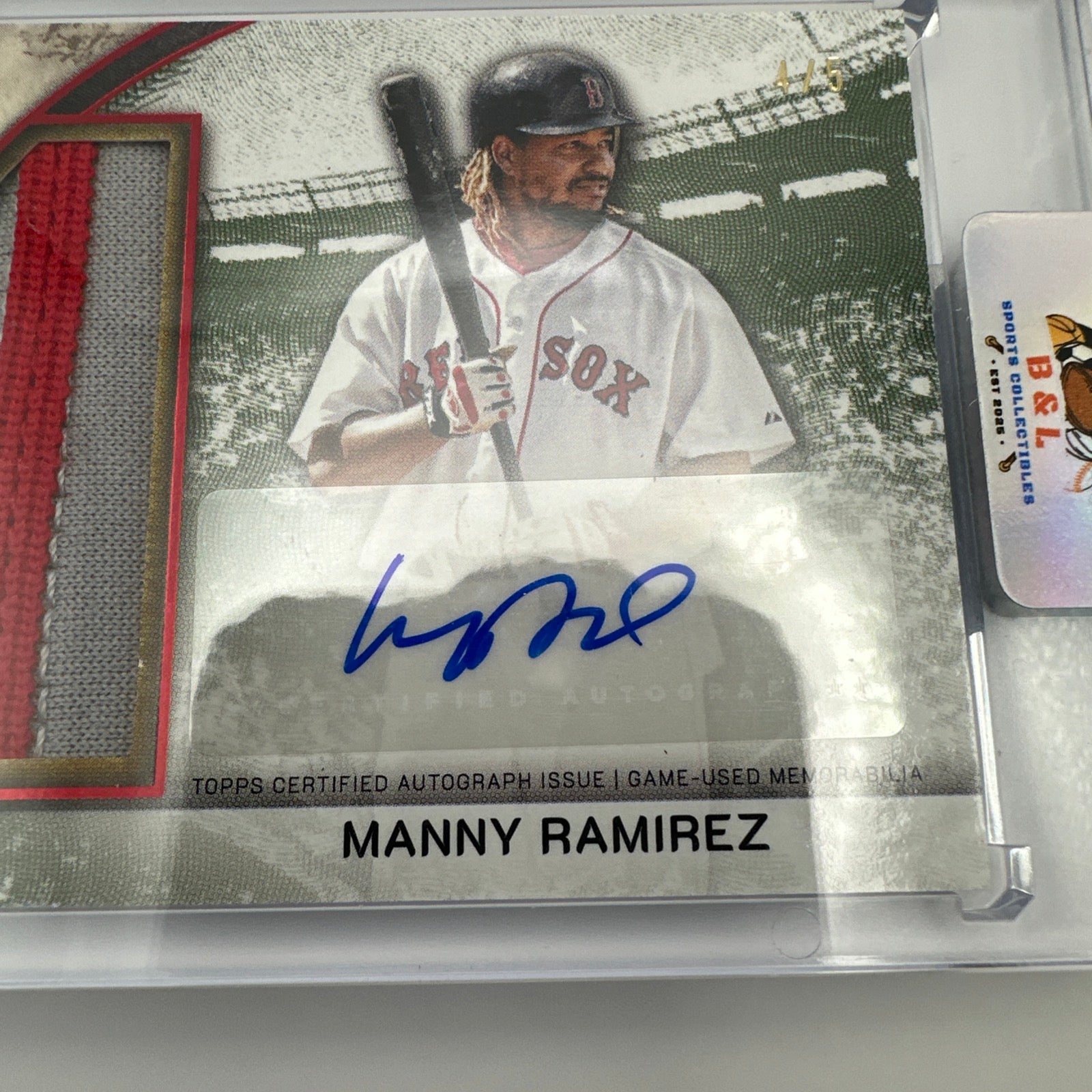 The product is a rare and highly sought-after 2025 Topps Museum Manny Ramirez Momentous Material Jumbo Patch Auto Ruby card numbered 4/5. Autographed by Manny Ramirez himself, this baseball trading card features a jumbo patch from the Boston Red Sox player's jersey. This unique and limited edition card is a must-have for any serious collector, showcasing both the quality and prestige associated with Topps cards. With its exclusive features and heightened rarity, this card is sure to be a standout addition to any sports memorabilia collection.